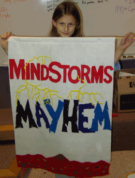 You may be wondering how we got our unusual name. After brainstorming many ideas for names, we decided on Mindstorms Mayhem. The "Mindstorms" part came from the Lego Mindstorms Robotics Invention System technology that we use to build our Lego robots. The word "mayhem" seemed to fit our early programming attempts which sometimes caused the robot to wreak havoc and disorder on the FLL table full of mission models.